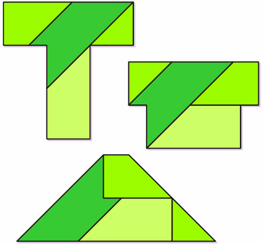 Vào đầu thế kỷ 20 người ta đưa ra các mảnh đó và cố gắng ghép để tạo thành các hình khác nhau, chữ T “béo” bên phải do Manuel R. Pablo (đến từ Washington) tìm ra, hình gần giống hình tam giác do Hoi Polloi (đến từ New York) tìm ra năm 1975.